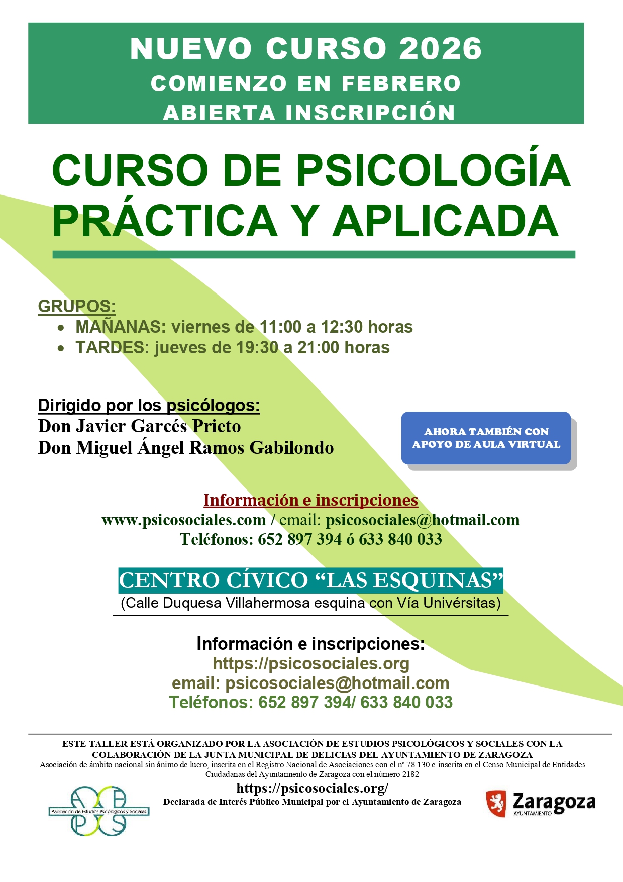Este curso ofrece una formacón completa y de calidad sobre los aspectos de la Psicología Científica más útiles para la vida personal o profesional. Su enfoque práctico potencia su utilidad y amenidad. Las clases se desarrollan de forma participativa, con un contacto y conocimiento personal entre los profesores y alumnos, para lo cual se garantizan grupos reducidos.