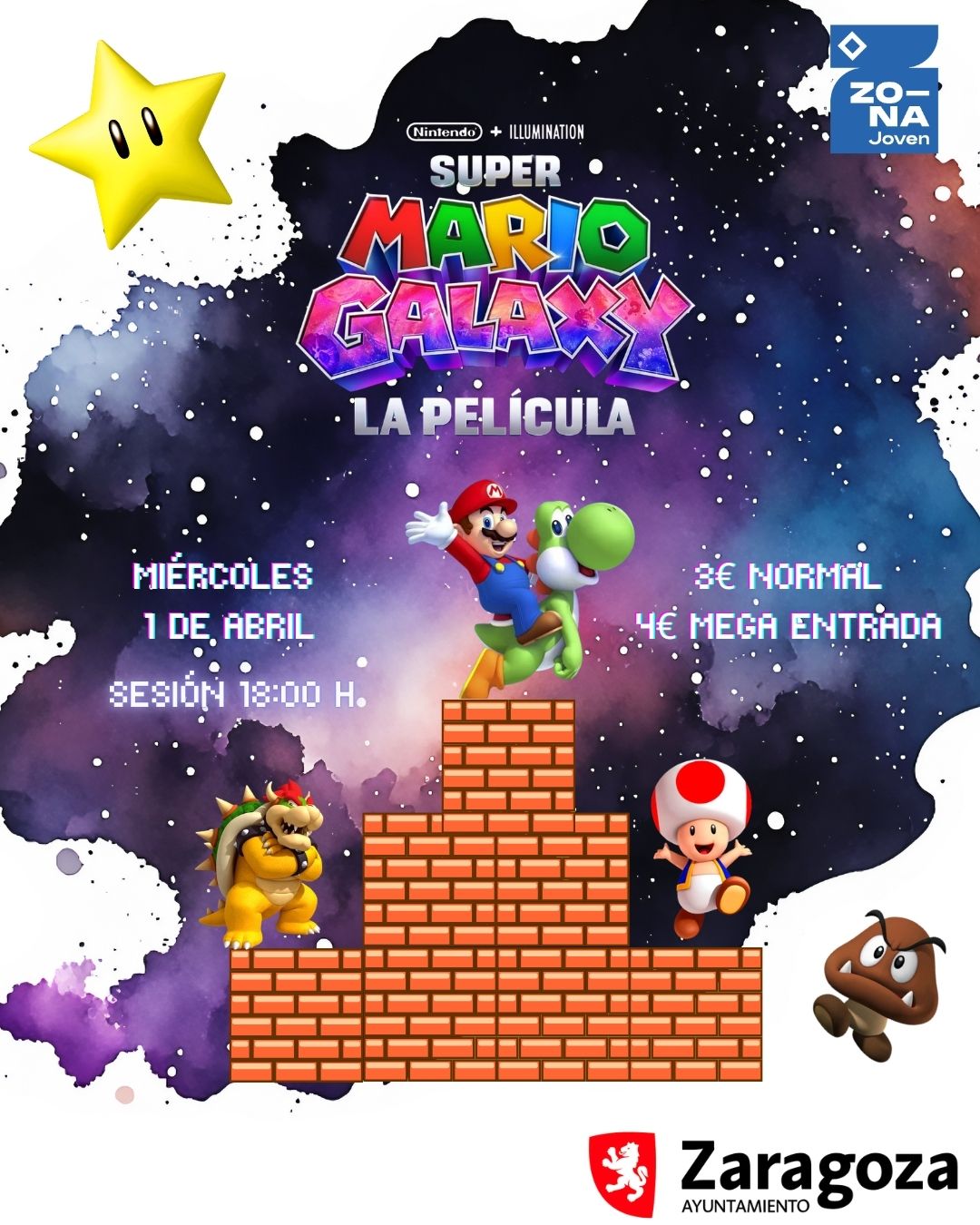 El miércoles 1 de abril iremos al cine Palafox para ver el estreno de la nueva película de Mario Bros. Importante: inscribirte antes del día 24 de marzo para contar con vosotros y elegir si queréis entrada normal por 3€ o megaentrada por 4€