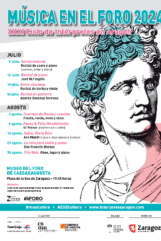 La llegada del verano volverá a unir música y patrimonio histórico con el Festival de Música en el Museo del Foro Romano de Caesaraugusta (Plaza de la Seo) con su XXXI edición. Durante los meses de julio y agosto, del 5 de julio al 30 de agosto la Asociación Aragonesa de Intérpretes de Música ha programado en el museo municipal nueve recitales de música clásica, tanto de solistas como de música de cámara, que presentarán un rico y variado repertorio de todas las épocas de la música. El Festival cuenta con 9 recitales de música clásica que se llevarán a cabo los viernes a las 19:15 horas.