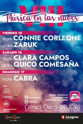 El Centro Cívico Delicias acogerá los días 15,16 y 17 de noviembre de la mano de Miguel Angel Fraile y Pilar Gonzalvo el VIII Festival Música en las Nubes, cuyo nombre evoca un viaje, el que realizan los músicos alternativos que transitan al margen de los circuitos comerciales y en el que se dan la mano la música tradicional, la música antigua, las músicas del mundo y la música clásica.