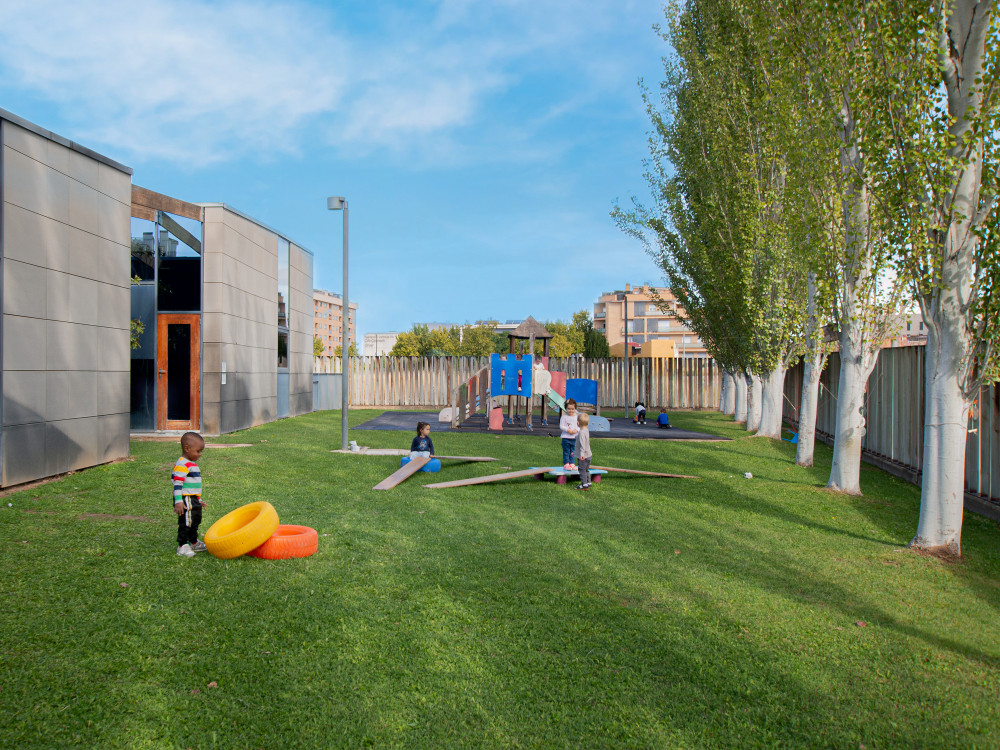 Esto es la escuela en general, pero también tenemos un espacioso jardín, dividido en diferentes zonas: una para los más pequeños, otra para los niños/as de 1 año protegido con un porche y con un arenero, otra para el resto de niños/as con zona de toboganes, otra zona de piedras que da al hall de la escuela, una entrada con cemento que aprovechamos para jugar cuando hace buen tiempo y un pequeño huerto donde sembramos hortalizas y verduras. Todas las aulas tienen grandes ventanas que dan al jardín, muy luminosas y ventiladas y todas tienen puerta de acceso directo al jardín.