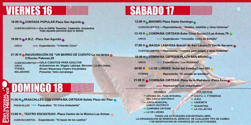 El Ayuntamiento de Zaragoza, a través del Plan Integral del Casco Histórico y junto con distintas entidades sociales, ha organizado para este próximo fin de semana, días 16, 17 y 18 de mayo, la actividad "Un barrio de cuento", un programa que llenará las calles del Casco Histórico de imaginación y creatividad con la presencia del cuento.