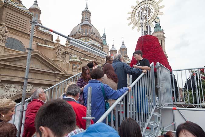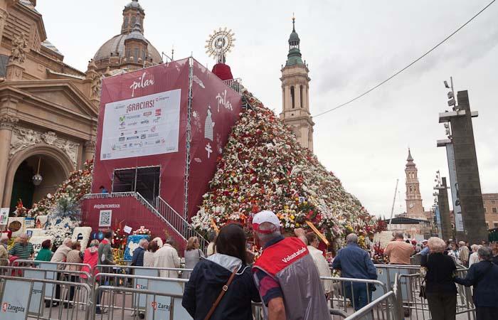 La pasarela fotográfica ubicada en el manto floral de la Virgen del Pilar ha registrado ya la visita de más de 5.000 personas desde la noche del 12 de octubre hasta hoy, de las que prácticamente la mitad han hecho uso del servicio de fotografía profesional. El acceso a esta pasarela, que se instaló por primera vez el año pasado y es completamente gratuita, se realiza a través de cita previa y de forma libre. En el primer caso, el visitante se evita la molestia de esperar, mientras que en el segundo, el acceso a la plataforma está sujeta a la disponibilidad de horarios. En este sentido, la reserva de cita previa está ya completa hasta el próximo 19 de octubre, por lo que los interesados en acceder deberán hacerlo de forma libre.