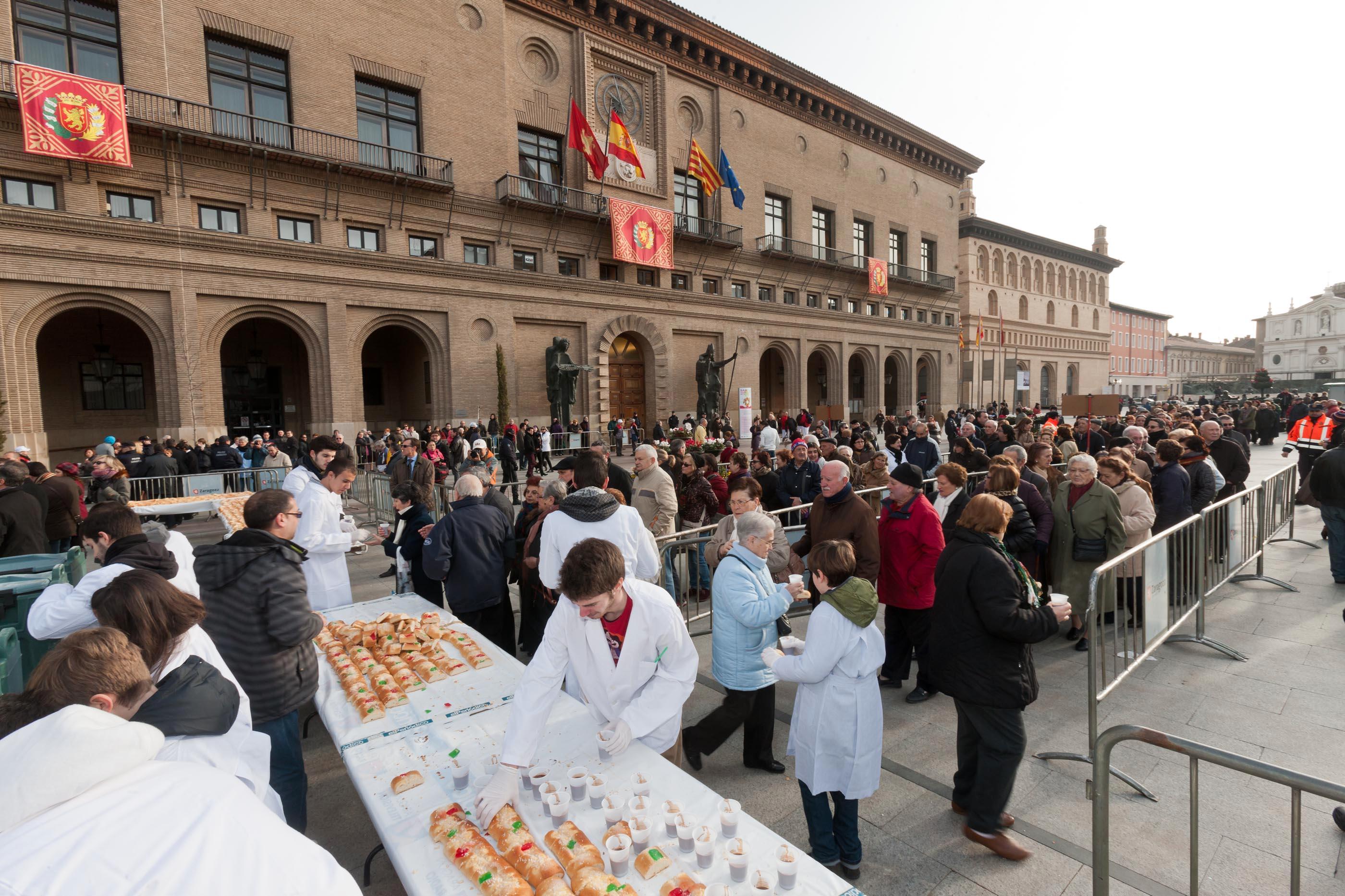 El reparto del tradicional roscón en la Plaza del Pilar es uno de los actos más multitudinarios de San Valero. Se organiza en colaboración con El Periódico de Aragón y comienza a repartirse a partir de las 10,00 horas. También a esa misma hora, el alclade de Zaragoza, Pedro Santisteve, dará la bienvenida a los primeros visitantes de la Jornada de Puertas Abiertas del Consistorio, visitas guiadas que se realizarán en horario ininterrumpido hasta las 20,00 horas, y en las que la ciudadanía podrá conocer distintas dependencias municipales.