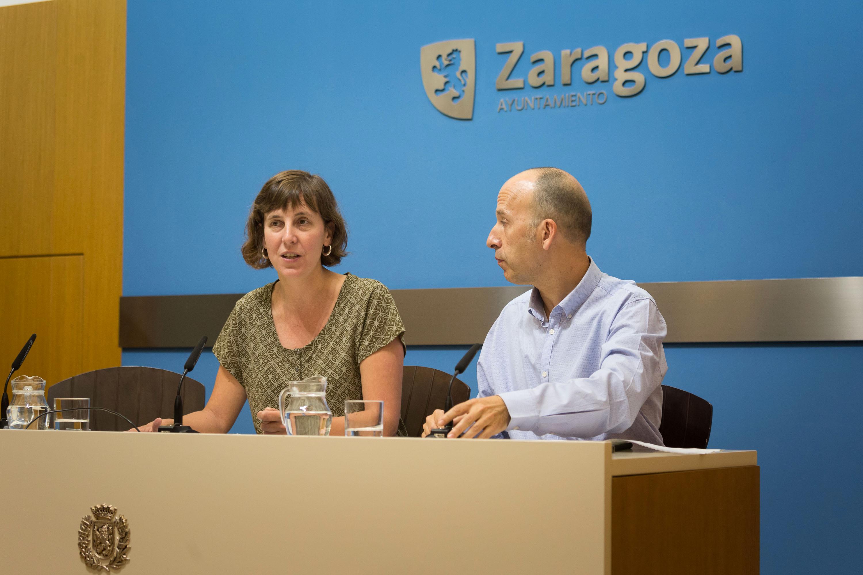En el marco de la Estrategia de reducción de emisiones 20/20, la concejala de Medio Ambiente y Movilidad, Teresa Artigas, y el portavoz del grupo municipal de Chunta Aragonesista, Carmelo Asensio, han presentado hoy en rueda de prensa cuatro nuevas instalaciones solares.