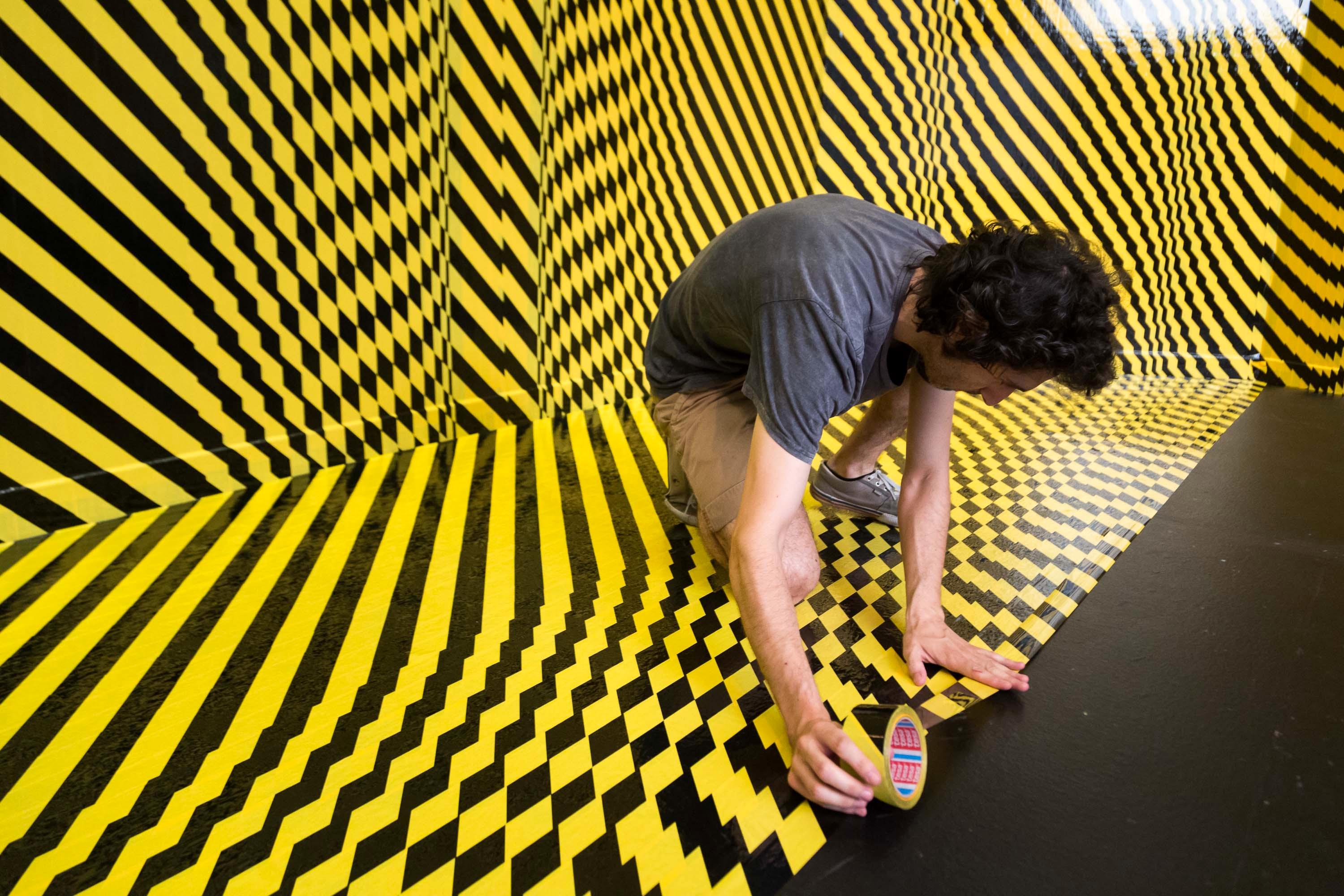 El Espacio Tránsito del Centro de Historias ha abierto sus puertas, desde el 13 de julio y hasta el próximo 10 de septiembre, a la exposición de Víctor Solanas-Díaz titulada "Out of Neither". Este artista, guipuzcoano pero afincado en Zaragoza, interviene en el suelo y las paredes con cinta señalizadora amarilla y negra para convertirlo en un espacio modificado por efectos ópticos.