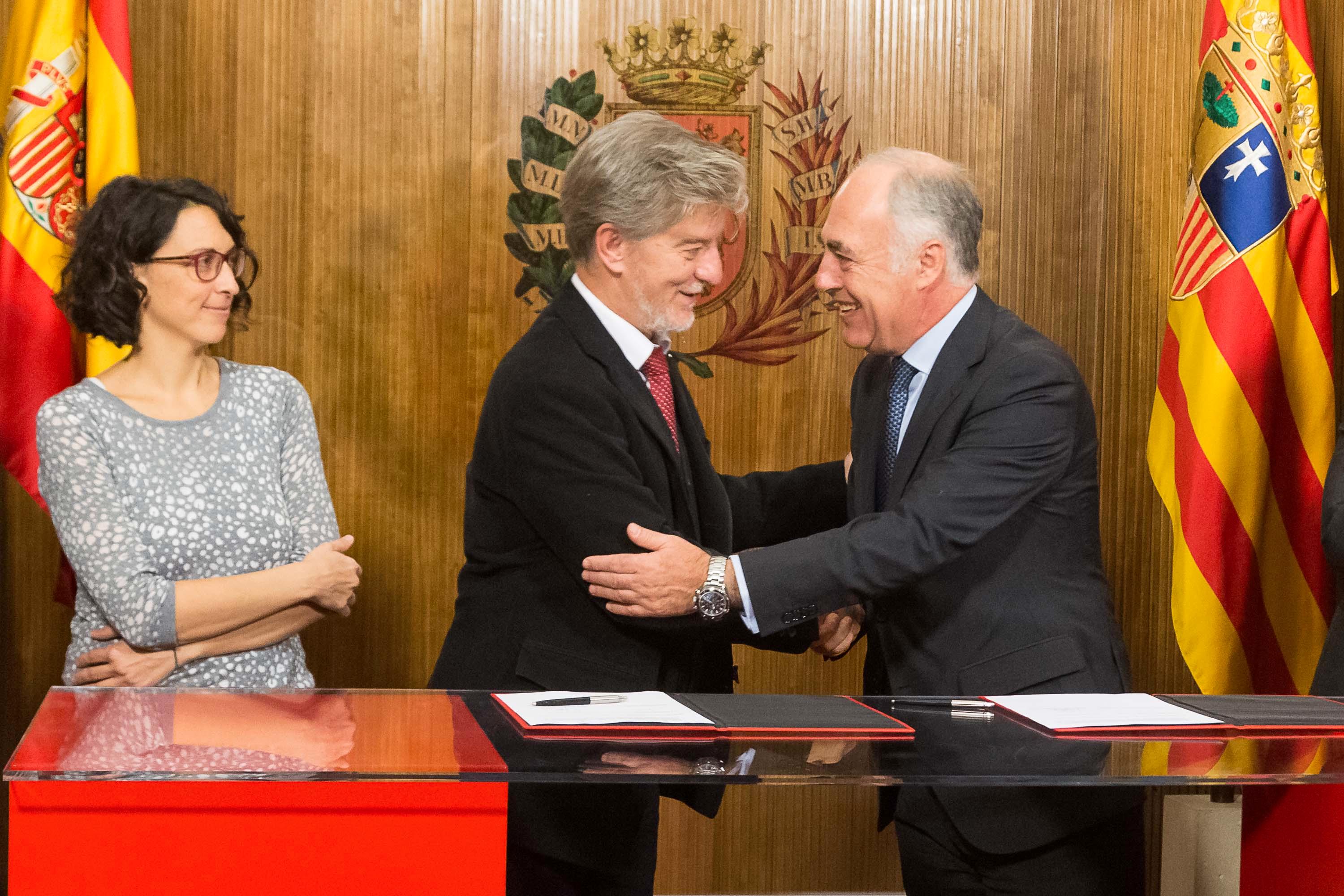 El alcalde de la ciudad y presidente de la Fundación, Pedro Santisteve, y el director general de la Fundación Bancaria Ibercaja, José Luis Rodrigo Escrig, han rubricado este acuerdo para los próximos tres años