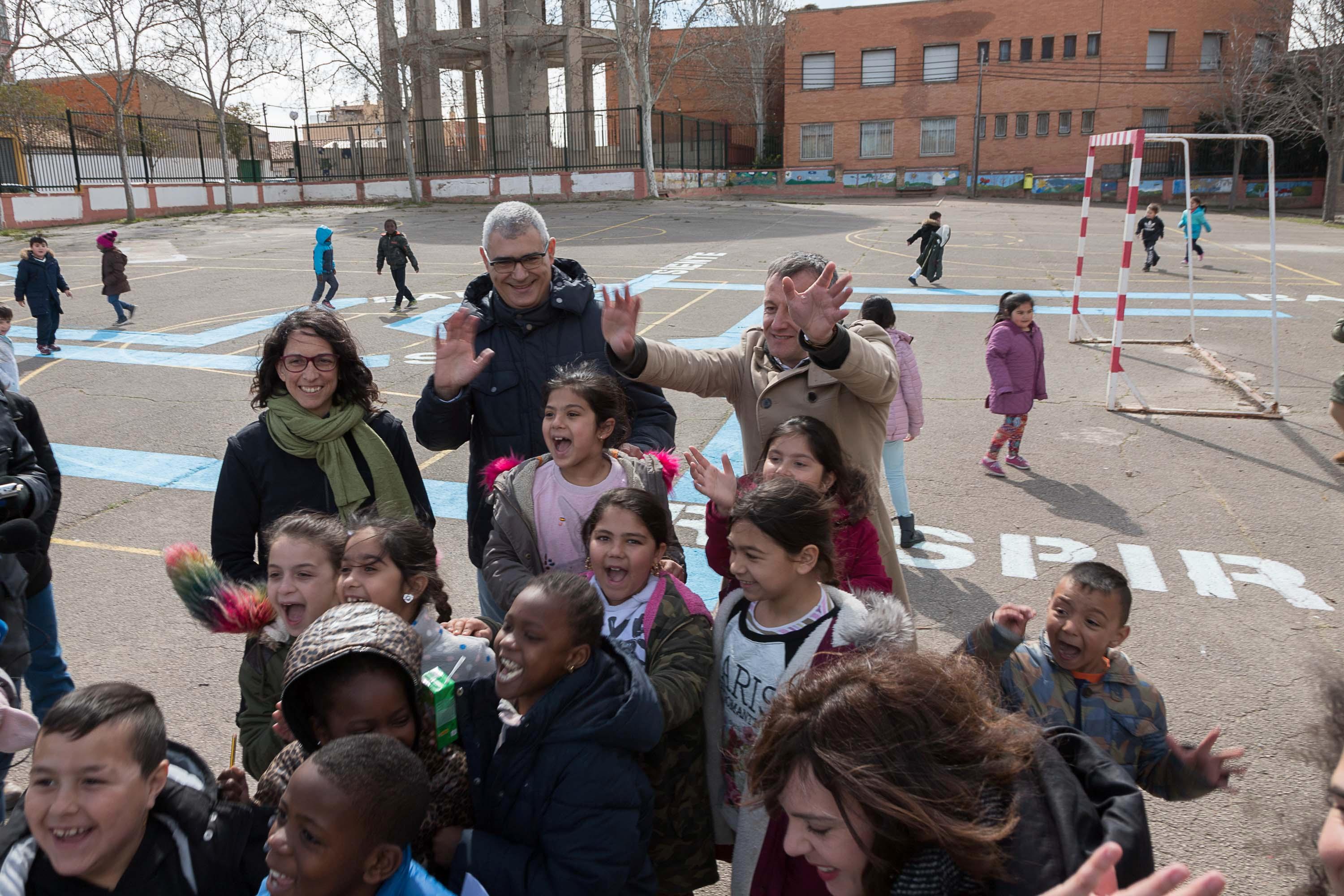 El consejero de Cultura, Fernando Rivarés, y la Consejera de Participación y presidenta de la Junta de Distrito de Oliver-Valdefierro, Elena Giner, han presentado hoy en el CEIP Fernando el Católico el proyecto La Máquina de Bailar, que está llevando a cabo en este colegio público el Festival Trayectos, que dirige Nati Buil.