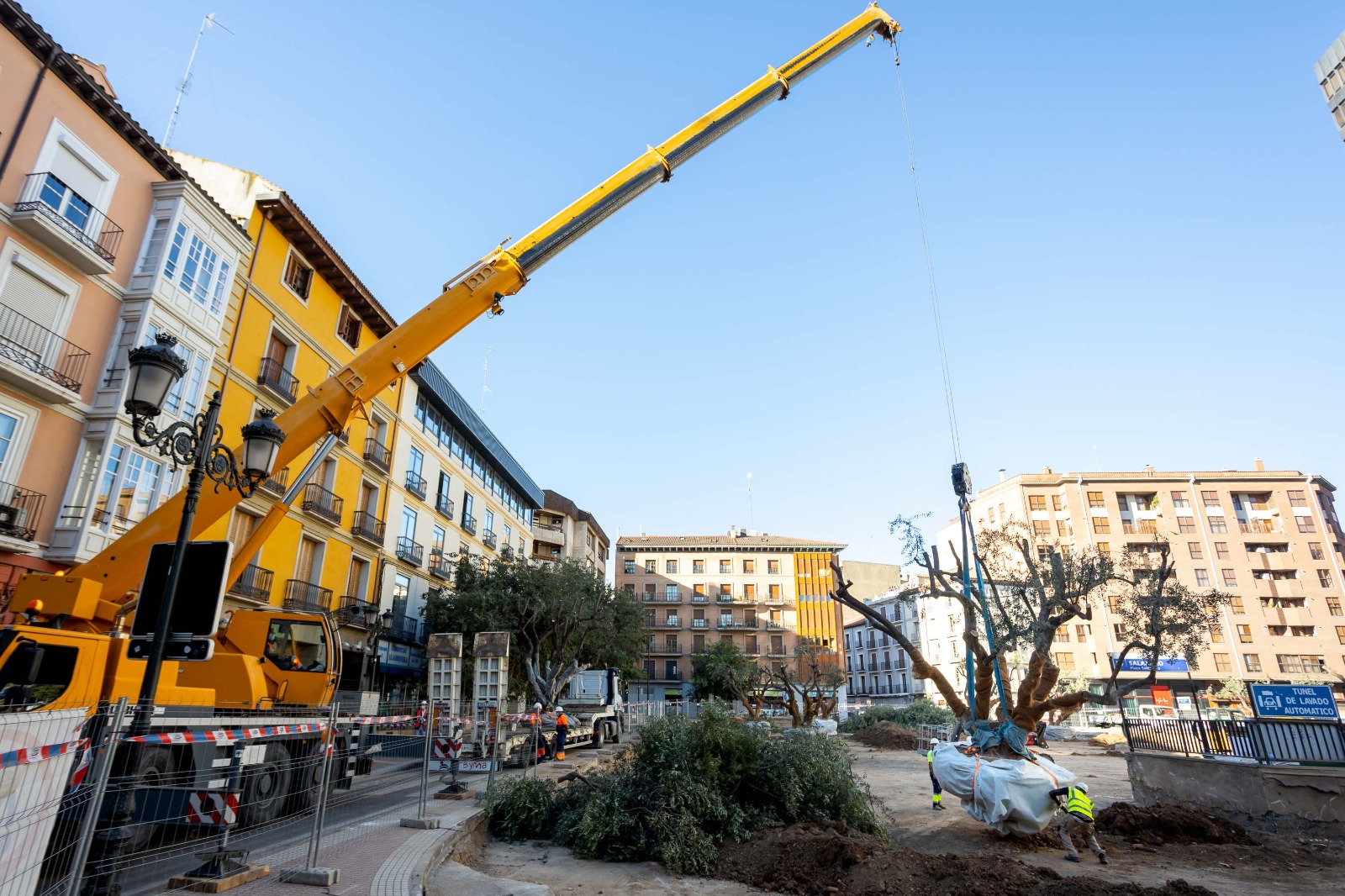 Los once olivos de la plaza de Miguel Salamero en Zaragoza comienzan a trasplantarse desde este miércoles siguiendo el protocolo que marcan las Normas de Jardinería y Paisajismo de grandes ejemplares. Las tareas de trasplante se han dividido en tres fases en esta última semana: primero, la poda y preparación de los ejemplares durante el lunes y martes; después, el traslado de los olivos, que se prevé realizar entre este miércoles y jueves; y, por último, el trasplante de los árboles el viernes en un vivero.