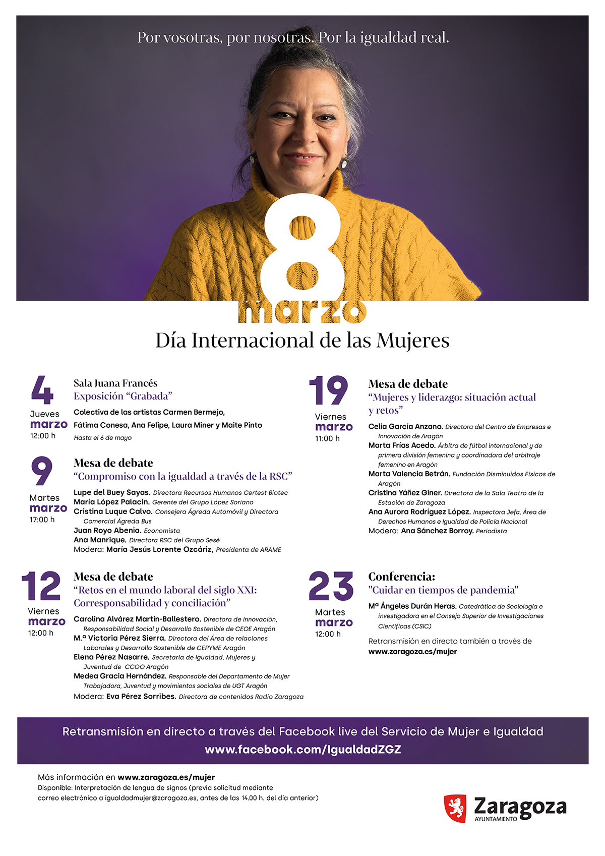 El Ayuntamiento de Zaragoza ha organizado un amplio programa de conferencias y actividades que se retransmitirán online, de la mano de un elenco de mujeres trabajadoras que ocupan cargos de responsabilidad en sus empresas. Las mesas redondas organizadas por el Servicio de Igualdad comenzarán el 9 de marzo con el debate ‘Compromiso con la Igualdad a través de la RSC’, moderado por la presidenta de Arame, María Jesús Lorente. En ella, intervendrán la gerente del Grupo López Soriano, María López, la directora de Recursos Humanos de Certest Biotest, Lupe del Buey, la consejera delegada de Ágreda Automóvil, Cristina Luque, o la directora de RSC de Grupo Sesé, Ana Manrique.