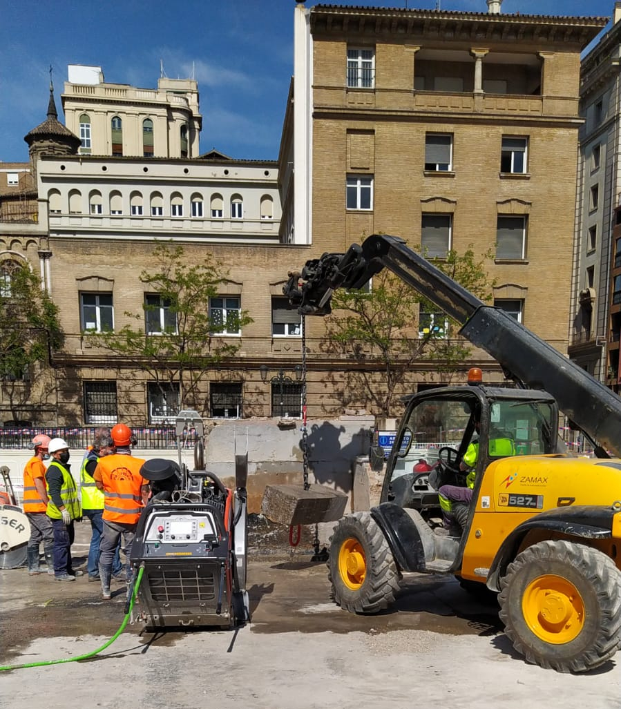 Los técnicos y encargados de la dirección de la obra han diseñado esta operación de corte y retirada mediante un procedimiento mixto. Para las labores que se han comenzado hoy se empleará maquinaria ligera que quitará las piezas pequeñas, comenzando por la zona central de la plaza. Así se irá avanzando desde el centro hacia la zona perimetral. Después, los fragmentos más grandes y voluminosos serán sacados de la plaza con la ayuda de una grúa autopropulsada que se ubicará en diversas posiciones en el perímetro, sobre la calzada. Así, poco a poco, se irá dejando al descubierto el primer sótano del aparcamiento.