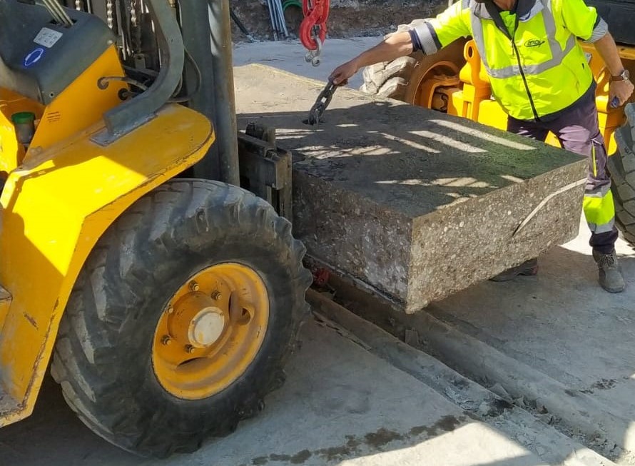 Esta fase de las actuaciones, que se prevé que se extienda hasta verano, supone la retirada de la losa de la cubierta. Antes de ello, para poder llevar a cabo estos trabajos, se han tenido que realizar las labores de marcado en superficie de las piezas mediante un precorte en el mortero de protección para ahora acometer el corte definitivo.