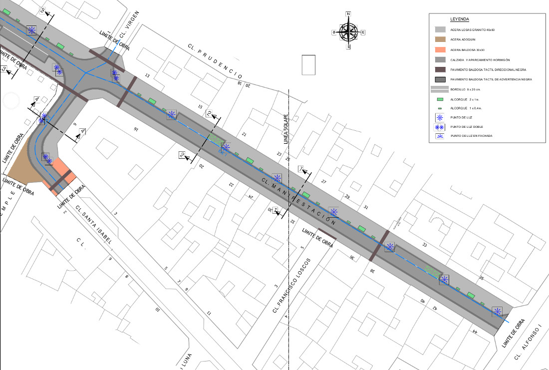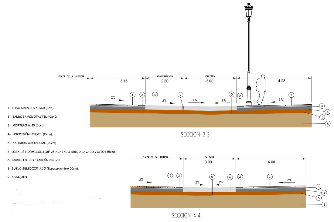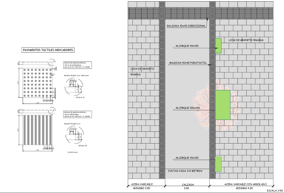 La velocidad en esta vía se limitará a 20 kilómetros por hora y la prioridad será peatonal. Para la calzada y la zona de aparcamiento, se ha optado por un pavimento continuo de hormigón acabado con árido visto y tamaño máximo del árido 12 mm, por su mayor durabilidad y fácil conservación. Para las aceras, está previsto colocar losa de granito de dimensiones 40 x 60 cm y de 6 cm de espesor. En el límite entre la banda de circulación de vehículos y las bandas peatonales se coloca baldosa podotáctil de advertencia, con contraste de color, delimitando la zona de tránsito seguro, con una anchura de 40 cm. Asimismo, se proyecta baldosa podotáctil direccional, con contraste de color, en los puntos de paso preferente de peatones, de fachada a fachada así como en zonas de cruces de calle o pérdida de línea de fachada.