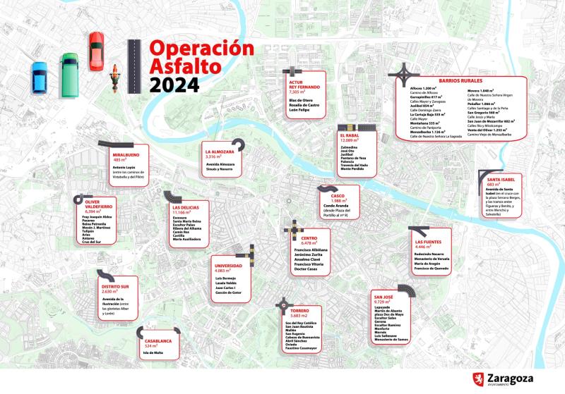 El Gobierno de Zaragoza ya tiene listo el proyecto de la Operación Asfalto de este 2024 que se extenderá a 77 calles distribuidas en los 15 distritos urbanos de la ciudad y en otros 11 barrios rurales del término municipal, todo ello con una inversión global de 2.499.994,70 euros (IVA incluido) que afectará a una superficie total de 86.585 m².