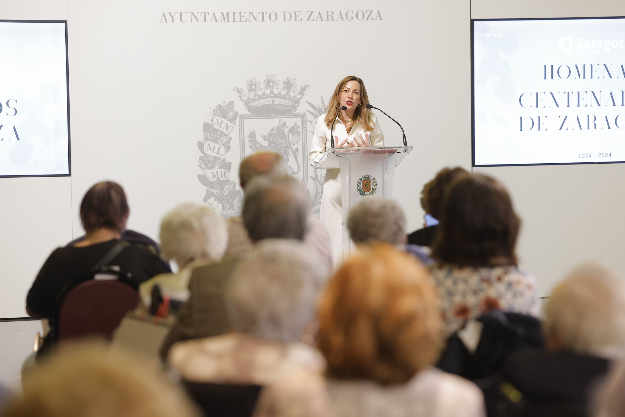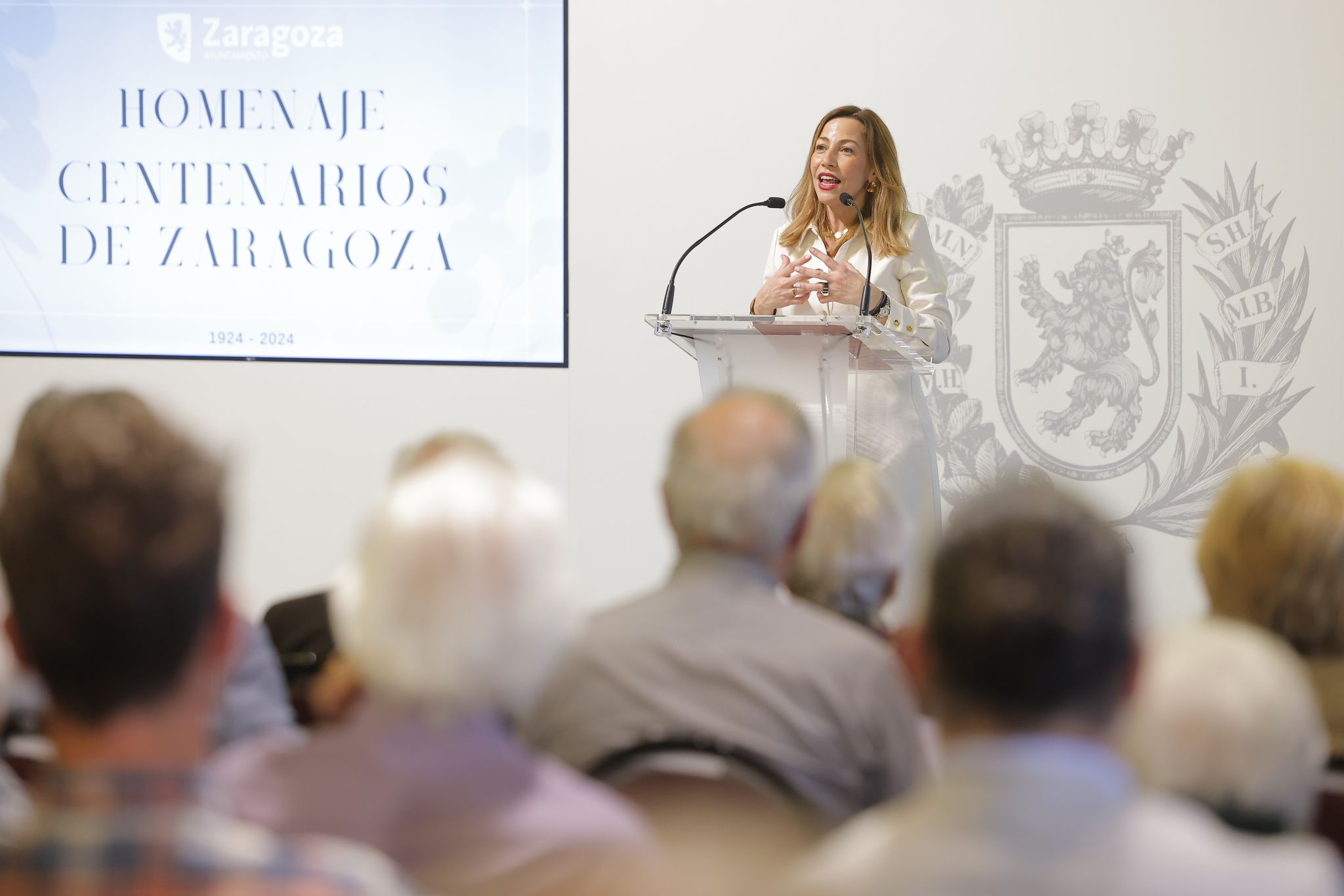 El Ayuntamiento de Zaragoza ha rendido homenaje esta tarde a las personas de 100 años que viven en la ciudad, es decir, las nacidas en 1924, que son un total de 202 según datos del padrón municipal. De ellas, 58 (44 mujeres y 14 hombres) han podido asistir a este emotivo acto, en el que la alcaldesa Natalia Chueca -acompañada por la concejal delegada del Mayor, Paloma Espinosa- les ha entregado una insignia conmemorativa de plata de ley.