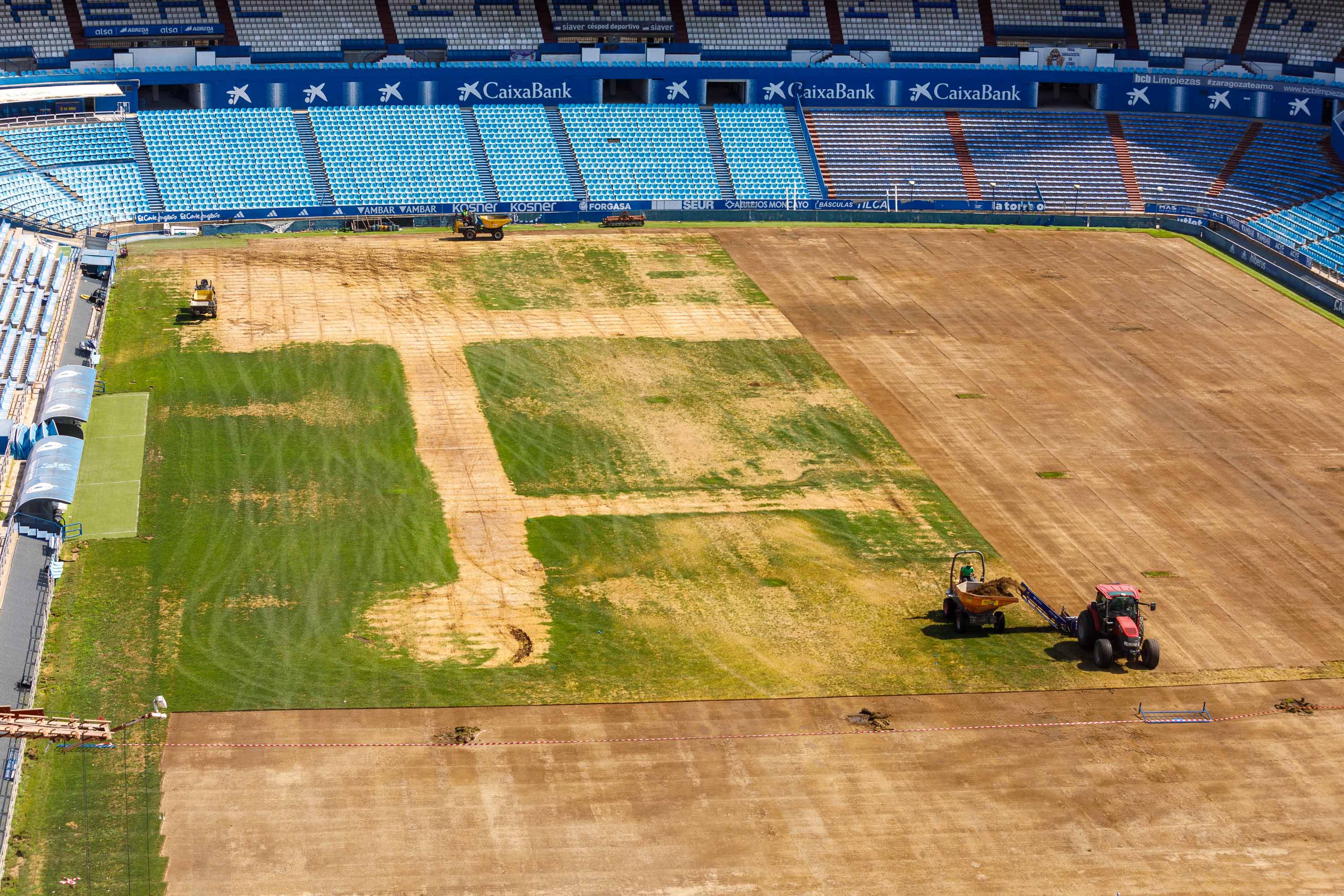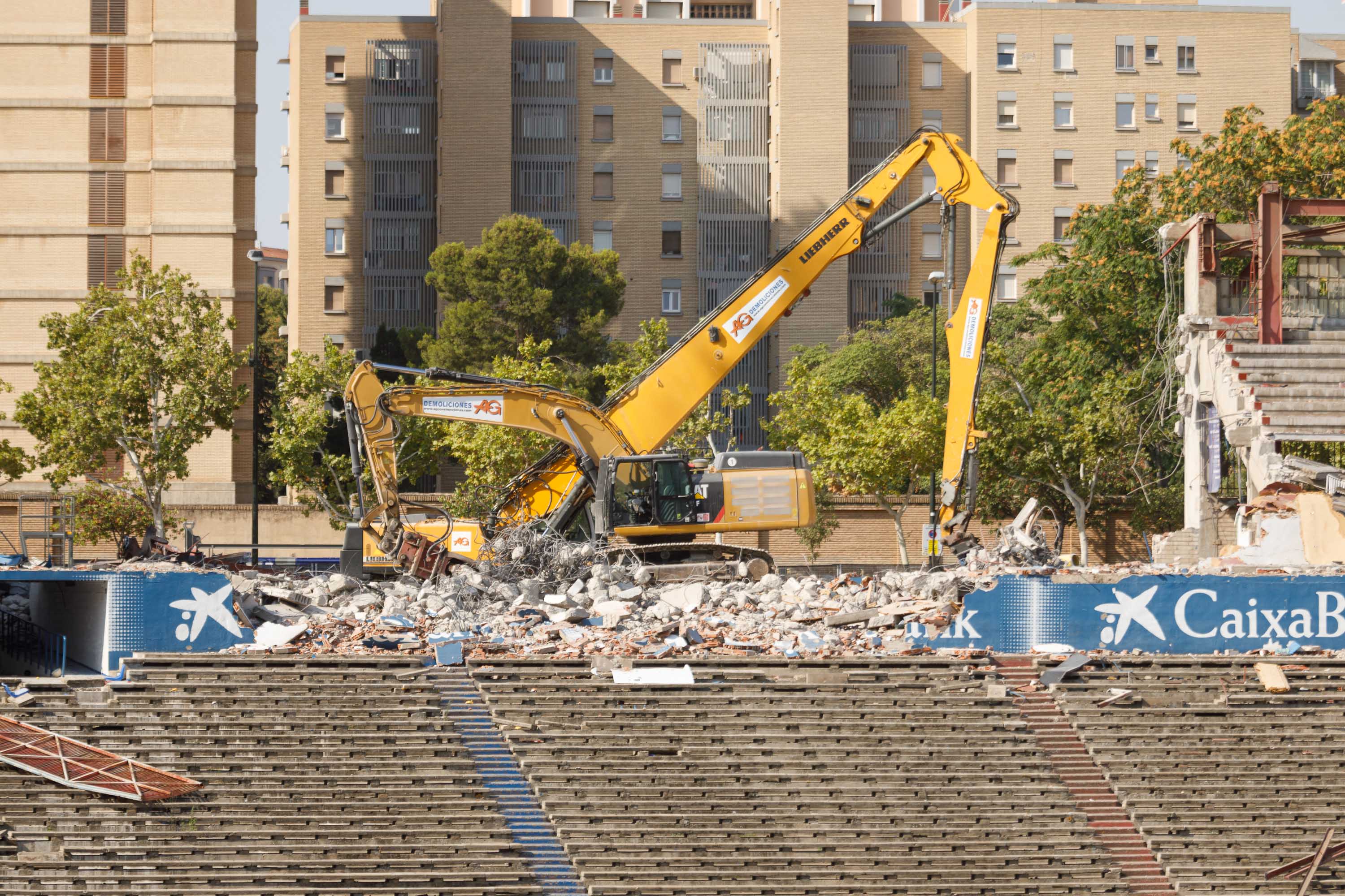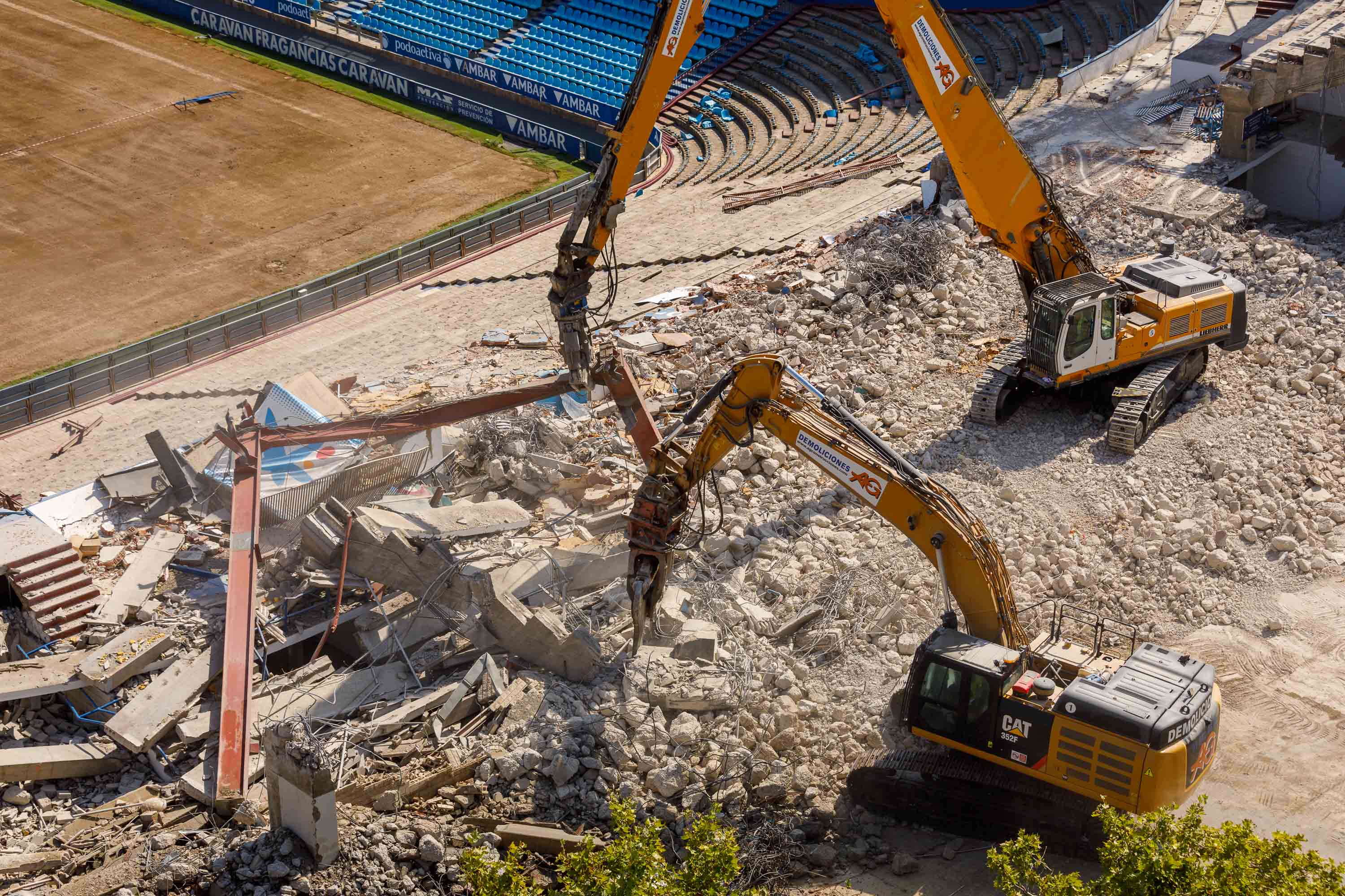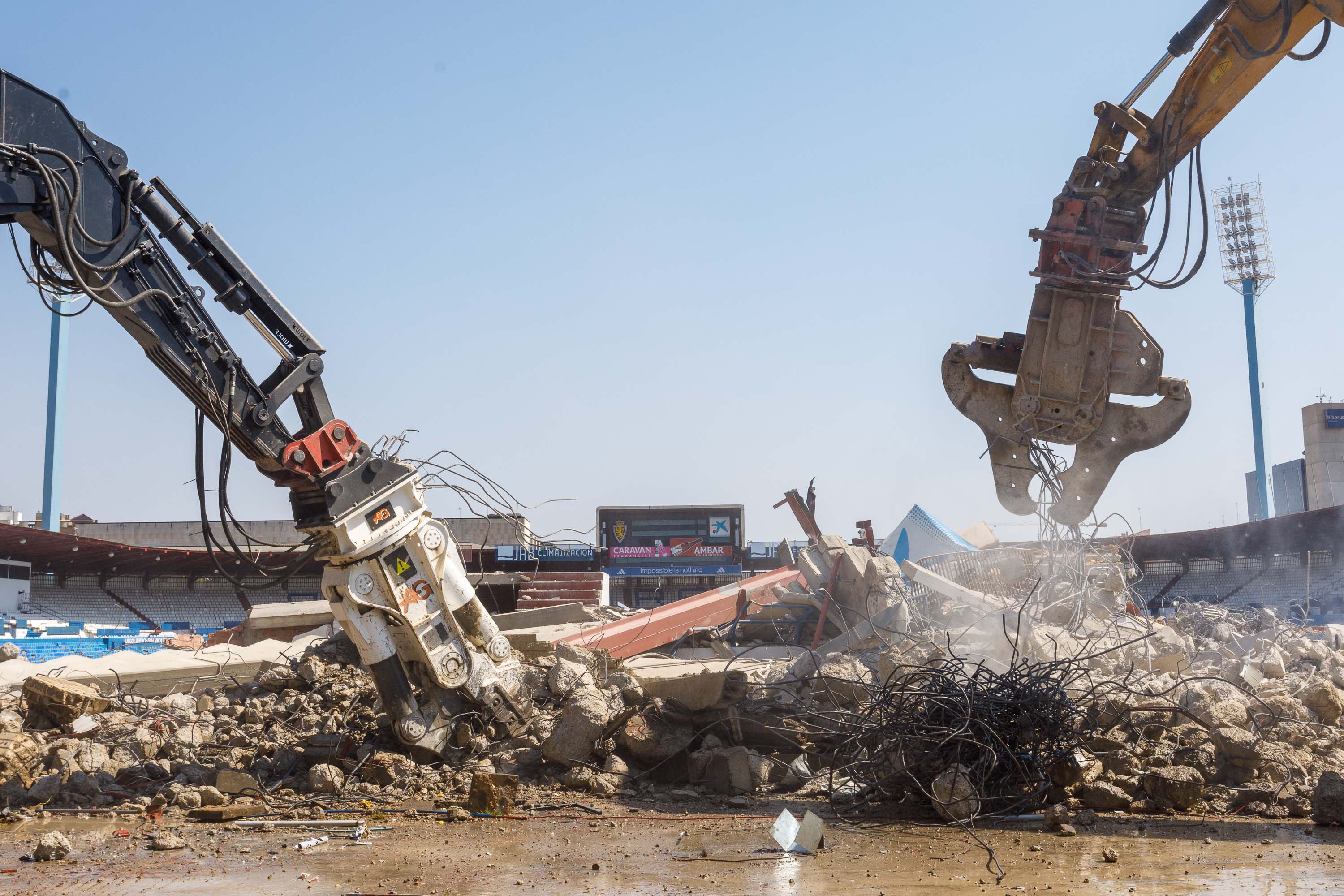 • Las gradas del Fondo Sur están en pleno proceso de demolición ya que, esta misma semana, se ha comenzado a derribar, desde el centro hacia los laterales, la zona superior para ir bajando a continuación a las localidades más cercanas al césped. Se estima que esta actuación concluya en 6 u 8 semanas. Además, los trabajos de la retirada del amianto de la cubierta incluidos en esta primera fase de demolición de La Romareda, han concluido con éxito.