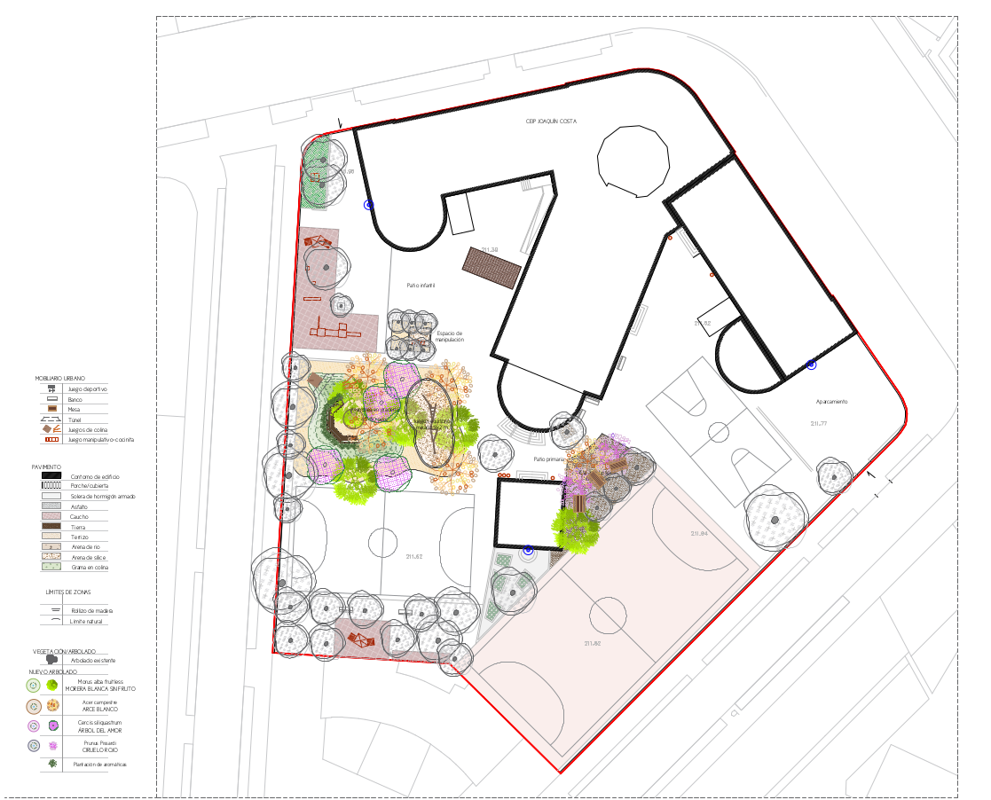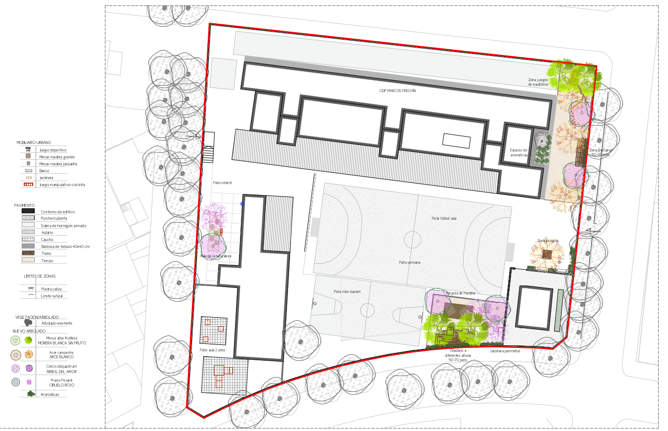 Este colegio cuenta actualmente con 34 unidades de arbolado, a la que se sumarán otras 15 nuevas. Las superficies blandas crecerán en un 15%, creando por ejemplo una zona nueva zona "de bosque", con cuatro árboles, que conectará de forma directa con el huerto escolar, así como una colina con juegos de trepa y un túnel en la antigua pista de baloncesto, que integrará una zona de asamblea que se podrá ser usada también como espacio educativo.