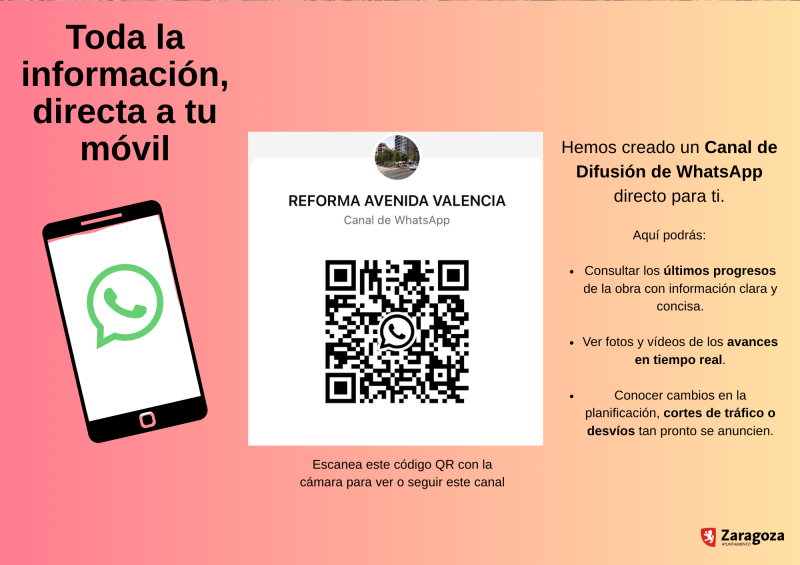 El sistema más directo para mantenerse informados y abierto a toda la ciudadanía será en Canal de Difusión de Whatsapp "Reforma Avenida Valencia", que se puede seguir o consultar a través del enlace directo disponible a tal efecto https://whatsapp.com/channel/0029Vb7OXEtA89MpTorQfj2u o bien escaneando el código QR con la cámara del teléfono móvil para verlo o seguirlo.