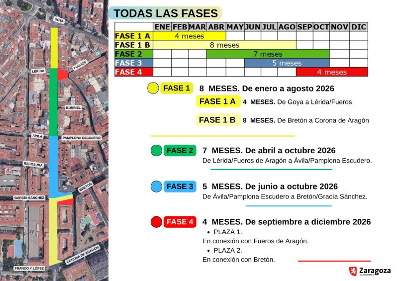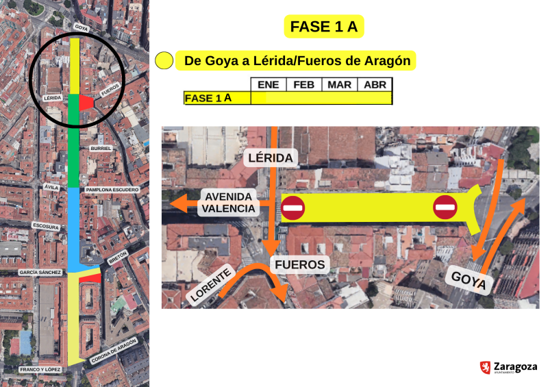 • Fase 1A. Durará cuatro meses (enero-abril 2026) y va desde la avenida Goya hasta el cruce con las calles de Lérida y de Fueros de Aragón.
