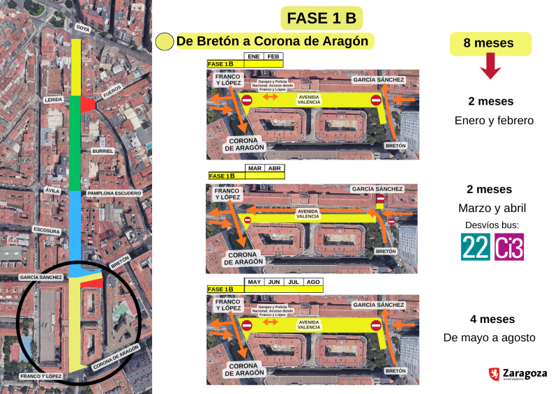 • Fase 1B. Durará ocho meses (enero-agosto 2026) y se centrará en el tramo entre Tomás Bretón y Corona de Aragón. En este caso, este tramo quedará cortado con acceso solo a residentes y a la Policía Nacional. Pero habrá dos meses, marzo y abril de 2026, en los que, para hacer la conexión con las calles García Sánchez y Tomás Bretón, se podrá usar este tramo de avenida en sentido de subida hacia al Hospital Clínico.