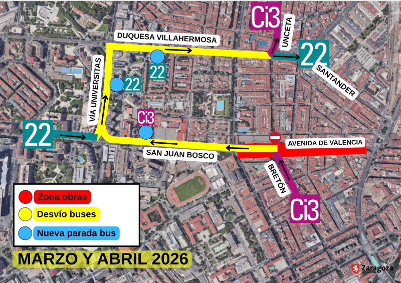 • Línea 22 (sentido Las Fuentes): evitará ese cruce desviándose por Vía Universitas y Duquesa Villahermosa, donde recupera su itinerario habitual.