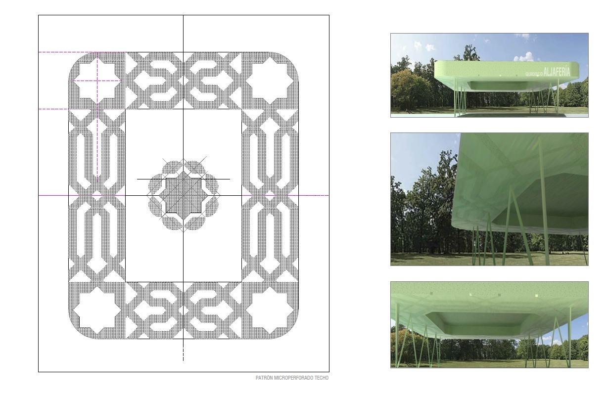 En este sentido, el diseño del espacio incorpora referencias ornamentales propias del palacio de La Aljafería, trasladando algunos de sus motivos geométricos y patrones decorativos a la configuración de la cubierta y su tratamiento interior. A través de microperforaciones y juegos de luz, especialmente visibles en horario nocturno, se recreará una atmósfera que evoca estos elementos históricos, estableciendo un diálogo entre pasado y presente y reforzando el carácter singular del equipamiento dentro del parque.