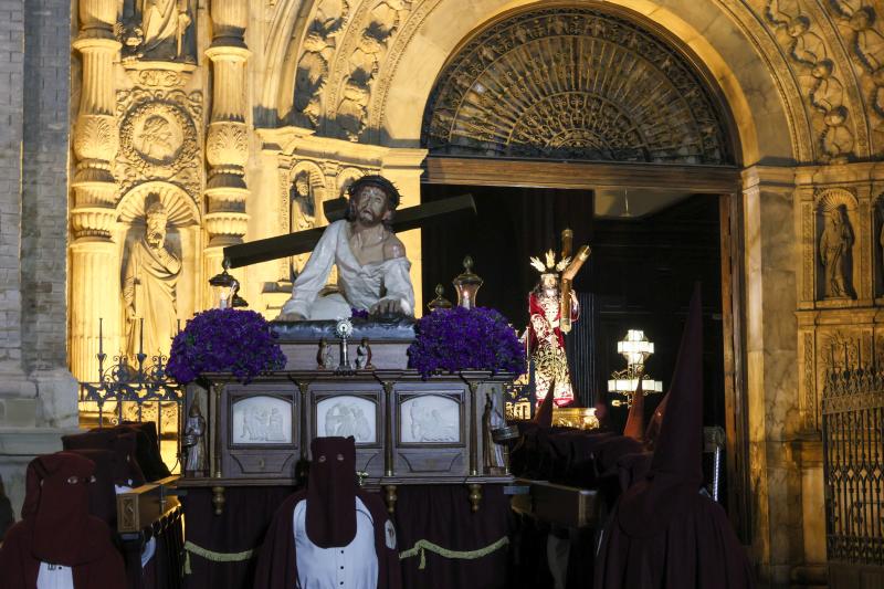 La procesión con los tres pasos de esta cofradía, la peana de Jesús en su primera Caída; la Caída del Señor y Jesús con la Cruz a cuestas han recorrido el centro de Zaragoza tiñendo de color marrón vinagre las plazas y calles de la capital.