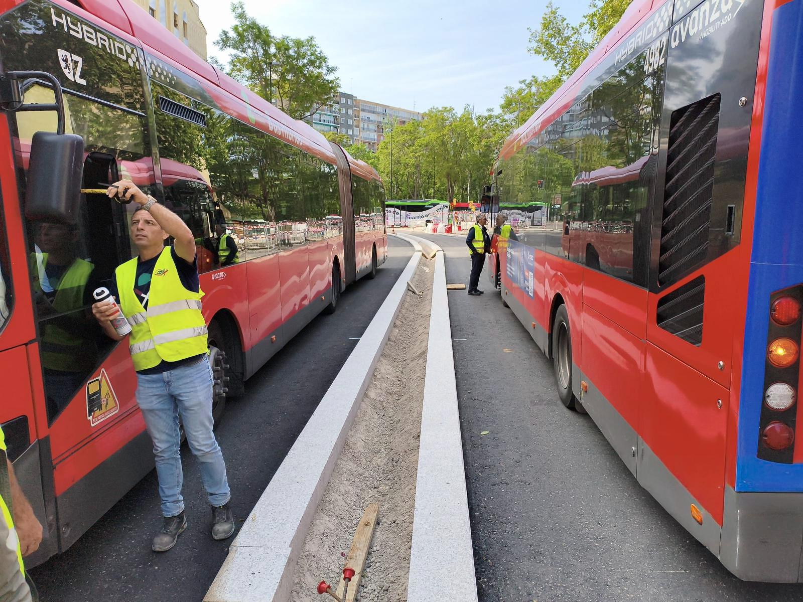 Los operarios han trasladado, junto a personal de Avanza, dos autobuses urbanos para comprobar que las mediciones y el itinerario en curva cumplen con todas las garantías para permitir el tránsito en paralelo de vehículos de emergencia
