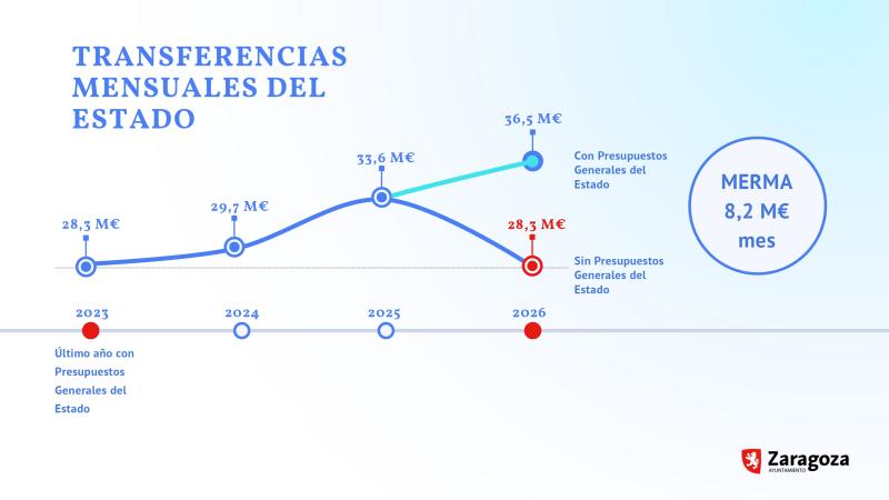 La ausencia de Presupuestos Generales del Estado provoca una merma de 8,2 millones de euros mensuales para el Ayuntamiento de Zaragoza