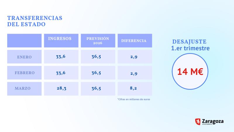 El Ministerio de Hacienda transfirió a Zaragoza 33,6 millones de euros en las mensualidades de enero y febrero de 2026, el mismo importe que en el ejercicio 2025. Esto supuso, ya en esos dos primeros meses del año, un desfase de 5,8 millones (2,9 millones por cada mensualidad) respecto a los 36,5 millones previstos. Sin embargo, en marzo la transferencia descendió hasta los 28,3 millones, aumentando así el desajuste mensual hasta los 8,2 millones. En suma, la diferencia entre la previsión y lo realmente transferido alcanza ya los 14 millones de euros en el primer trimestre de 2026.