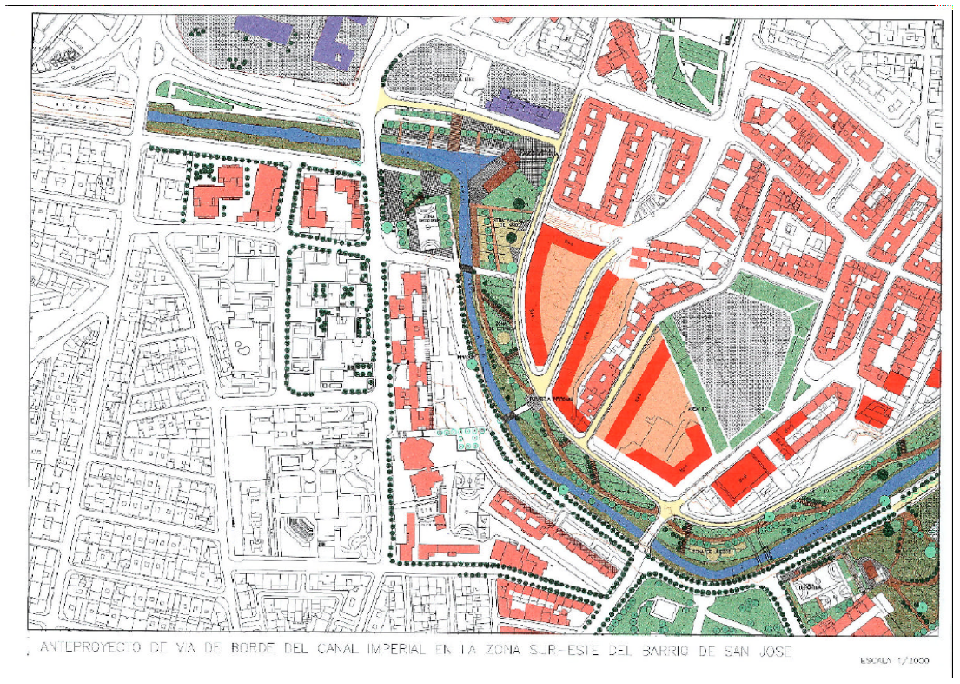 porEl PGOU tiene propuesto desde 2001 una intervención intensiva en la margen izquierda del canal a la altura del Barrio San José. Dado que esta operación de reforma comienza en esta zona, y que en 17 años todavía no ha superado la fase de anteproyecto, es una ocasión ideal para impulsarla. Desconozco la titularidad y la calificación urbana actual de los terrenos, en cualquier caso no debería ser un impedimento.