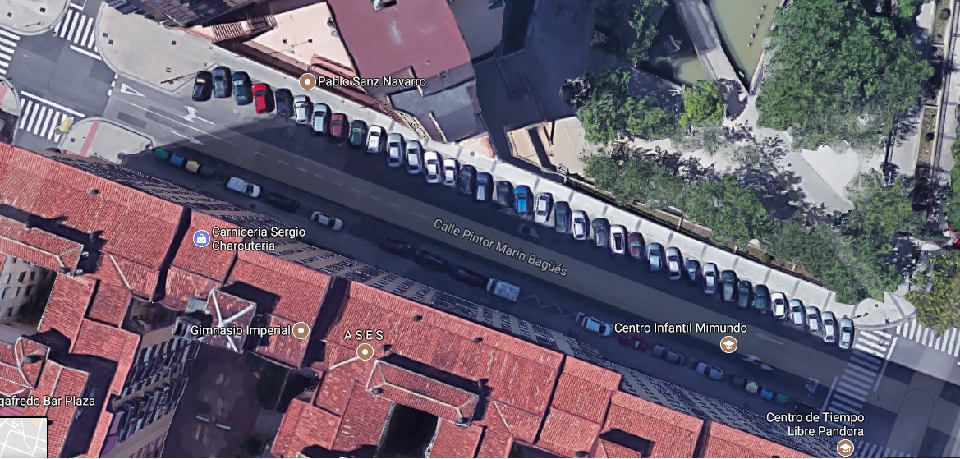 La calle Marín Bagüés dispone de dos carriles para vehículos, uno en cada sentido. Estos dos carriles son excesivamente anchos y hay una gran cantidad de espacio desaprovechado. Sin embargo, las aceras son muy estrechas.