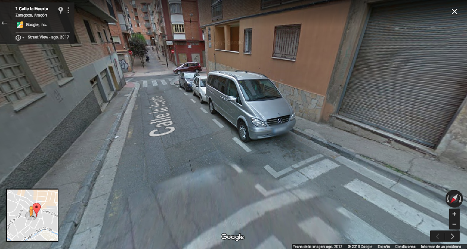 La calle Huerta, entre Salarullana de Dios y Zaragoza la Vieja, se encuentra sin renovar. Las aceras son estrechísimas (por ellas no puede transitar más de una persona a la vez), se encuentran en indignas condiciones y, sin embargo, se mantiene una fila de aparcamientos.