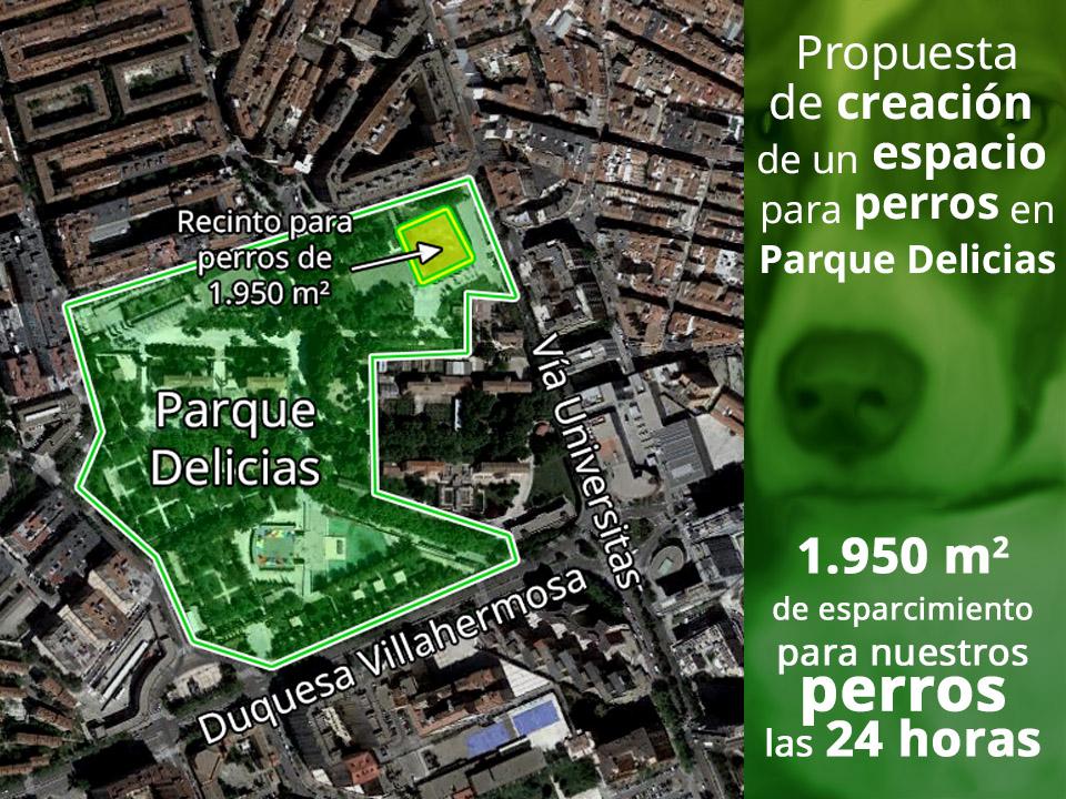 La propuesta consiste en crear un espacio vallado destinado al esparcimiento de perros en el Parque Delicias. Popularmente conocido como Pipican La ubicación ideal es el espacio existente en la esquina interiror del parque, entre Vía Universitas con Calle Hermanos Gambra. El espacio mencionado contaría con una superficie total de 1.950 metros cuadrados aproximadamente y, dado que la mitad del perímetro se encuentra ya vallada, solo serían necesarios 90 metros de valla nueva.