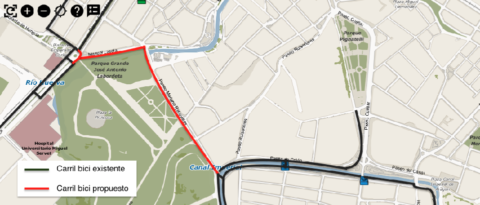 Se propone la creación de un carril bici que transcurra desde el Canal Imperial hasta la Romareda. Se barajan las siguientes alternativas: