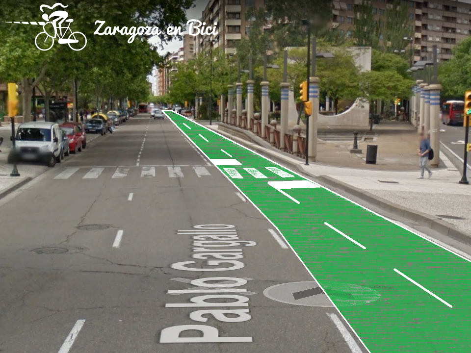 La gran avenida que vertebra el barrio, Pablo Gargallo, carece de carril bici pese a tener 3 carriles de circulación y 2 de aparcamiento. Se propone construir el carril bici en el lado Izquierdo, para evitar el peligro y conflicto en las paradas de autobús. Hacerlo en este lado también disminuirá las afecciones a las plazas de carga y descarga, paradas de taxis y otros aparcamientos.