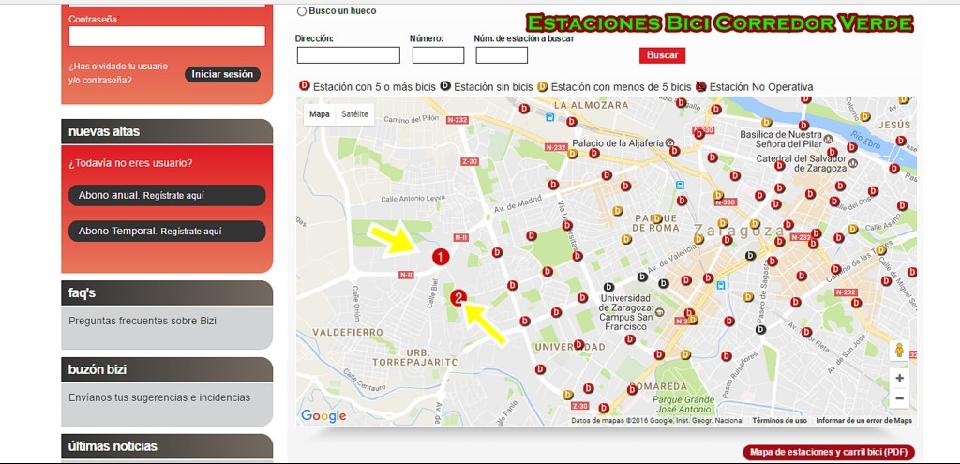 Actualmente el servicio BIZI mas próximo al Corredor Verde se encuentra en estas 2 estaciones 1-- C/ Océano Atlántico 2-114 - Vía Hispanidad - Avda. Duquesa Villahermosa 3-113 - Vía Hispanidad - Avda. Gómez Laguna Ya que el servicio usa el efecto mancha de aceite propongo su ampliación en 2 estaciones mas que podrían ser el inicio de la ampliación del servicio a zonas mas alejadas del Distrito ( se puede ver el mapa para las 3 nuevas estaciones ) 1-000-Calle Dr. Luis de la Torre Esteban PARQUE OLIVER 2-000-Calle Jarque de Moncayo,12 IES PIGNATELLI CPIFP LOS ENLACES