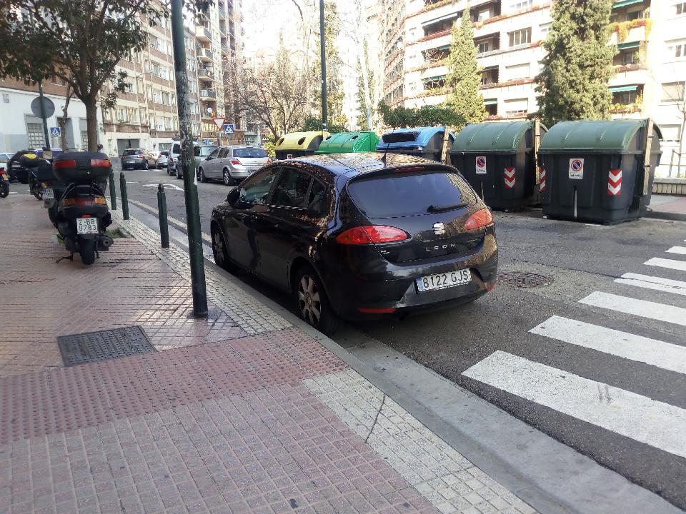 Delante del portal de María Moliner 26-32 hay una raya amarilla continua que impide parar y estacionar. Sin embargo, cuando se pintó y reguló había un contenedor de basura junto al paso de cebra (inmediatamente fue trasladado justo enfrente, donde ahora están), y la descoordinación entre los servicios municipales hizo que no que se esperara a su traslado, sino que se pintara justo hasta el contenedor. Al quitarlo apareció un espacio de 4,5 m. de aparente permisividad para parar y estacionar, cuando claramente el espíritu de pintar la la raya amarilla (e imagino que el proyecto que la ampara) iba destinado a impedir la parada/estacionamiento en ese espacio. Sucede que la presencia de un vehículo en ese espacio dificulta el tráfico, sobre todo a los camiones de basura, y es una invitación a que delante, en la raya continua, estacionen coches temporal o durante horas de modo irregular que en muchas ocasiones impiden directamente que pasen camiones de basura. De hecho, son numerosas las veces que tiene que venir la policía municipal y la grúa. Se propone pintar raya amarilla discontinua para poder parar en caso de alguna urgencia (discapacitados, personas mayores), pero impedir el estacionamiento.