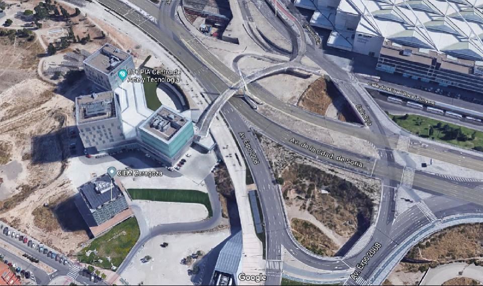 En la actualidad, uno de los extremos solo conecta con el edificio ETOPIA a través de escaleras, lo cual resta posibilidades de uso de la pasarela.