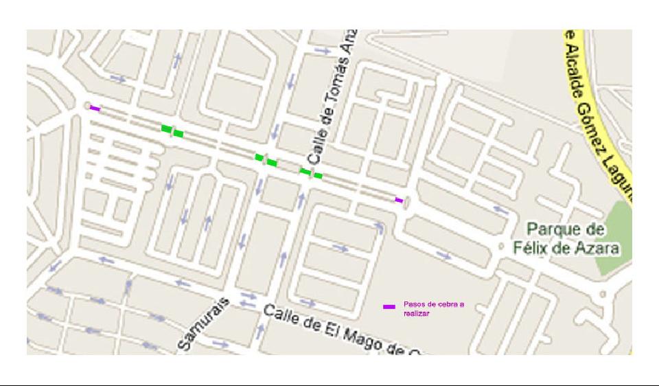 En el Bulevar de la av. de la Ilustración se realizaron a petición de nuestra asociación una serie de pasos de cebra para no poner en peligro la seguridad de las personas que cruzaban.