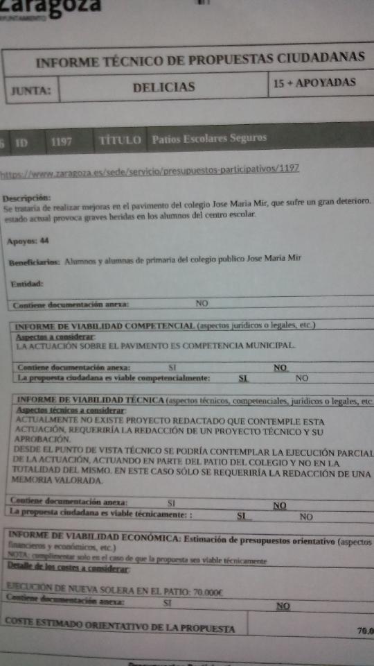 En la anterior convocatoria de Presupuestos Participativos (2017), se realizaron obras de mejora en el pavimento del patio del colegio citado, pero se hizo parcialmente, actuando solamente en parte del patio del colegio y no en la totalidad del mismo, debido a cuestiones técnicas (como se puede observar en el informe técnico que se adjunta como imagen).