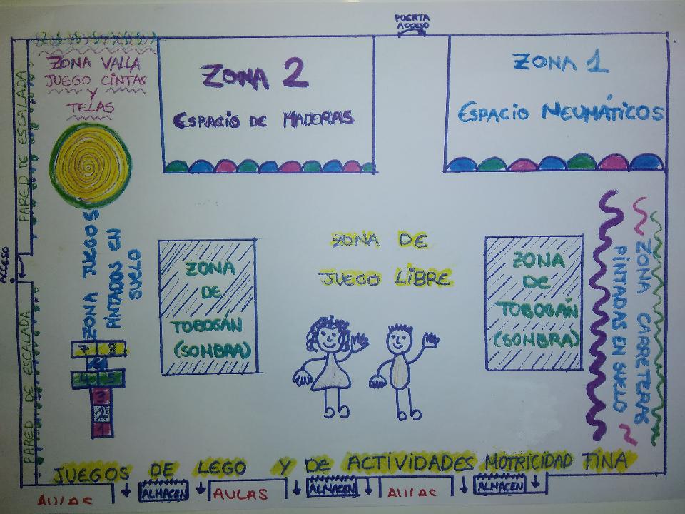 Adecuación del patio de infantil para convertirlo en un espacio que invite al juego, al aprendizaje y al contacto con elementos de la naturaleza. NUESTRAS PROPUESTAS SON: 1. Quitar la valla de infantil de madera y colores y utilizar neumáticos de tamaño estandar semienterrados en el suelo para delimitar los espacios y que se puedan usar como elemento de juego. Estos neumáticos, tendrían que estar pintados con la pintura adecuada para su correcta higiene y seguridad. 2. Quitar el riego, acondicionar el suelo limpiándolo de piedras, malas hierbas y dejarlo adecuado para su uso. Transplantar los árboles a un lugar más adecuado. 3. Quitar la fuente y reubicarla a un Iugar más adecuado para su uso, en la actualidad se encuentra en la mitad de una zona de juego de l@s niñ@s y no traga bien generando charcos que afectan a la seguridad.. Tiene que estar cubierta para proteger a l@s niñ@s de posibles accidentes. 4. Pared de escalada. La escalada infantil es una de las actividades que más beneficios reportan en el desarrollo de los más pequeños. Las habilidades motrices básicas salen muy reforzadas después de la práctica de este deporte. Para ello nos gustaría que se construyera una pared de escalada de mas o menos un metro y medio de alto por más o menos ocho de largo. El lugar podría ser en el llamado VALLA 1 (vease plano) o en alguna pared que da a las ventanas acondicionándolo para ello. 5. En la ZONA 2 (vease plano), nos gustaría dar lugar a una zona de maderas, donde poder tener materiales naturales. Troncos cortados de diferentes altura, algunos unidos mediante una pasarela, aprovechando así el espacio estrecho y alargado del que disponemos. 6. En la ZONA 1 (vease plano), dispondremos de una zona de juego con neumáticos. 7. Tanto la VALLA 1 como la VALLA 2, se utilizarian para ser decoradas mediante telas o diferentes materiales. Para ello se necesitarán diferentes cajas para poder guardar los materiales de juego. 8. Suelo. Nos gustaría disponer zonas de juegos pintados en el suelo, juegos de casillas numeradas, carreras de coches, laberintos, etc. 9. Paredes. En las paredes queremos disponer de juegos moviles como paneles Montessori, pizarras, texturas... y de cuatro paneles fijos tipo placas de Lego para que puedan jugar con dichos materiales. 10. Toldos. Nos gustaría disponer de más sombra en el recreo ya que está muy expuesto y solo contamos con dos zonas de sombra que no dan cabida a tod@s l@s niñ@s.