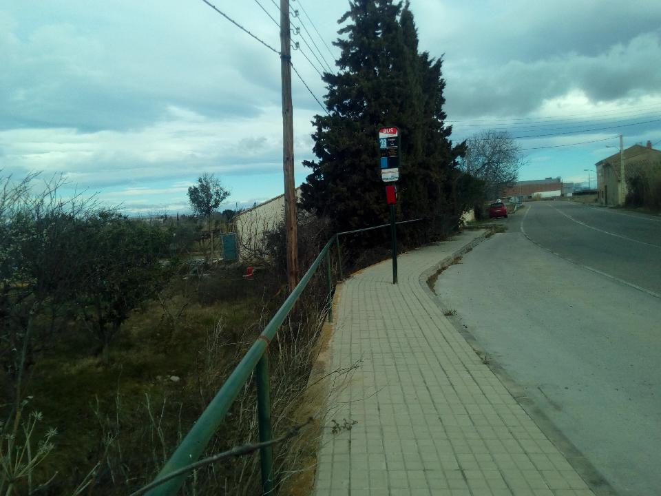 Hace años que se llevaron a cabo trabajos de adecuación en esta parada para la instalación de una marquesina, pero no se ha llegado a completar, Actualmente existe entre el borde exterior de la acera y el campo contiguo un un talud de mas de dos metros, que convierten cualquier caída accidental en peligrosa. Es parada para el autobús urbano y del transporte escolar del CPEP Hermanos Argensola e IES ITACA, transportes que requieren importantes tiempos de espera en este lugar.