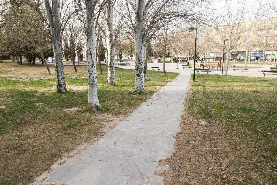 La senda de lajas que atraviesa el parque desde vía ibérica al quiosco de la música, de unos 32 metros de longitud, esta inservible a causa de la rotura y agujeros en las lajas. Consideramos construir la senda con arena fina compactada o adoquines de hormigón de 22x10 ctms.