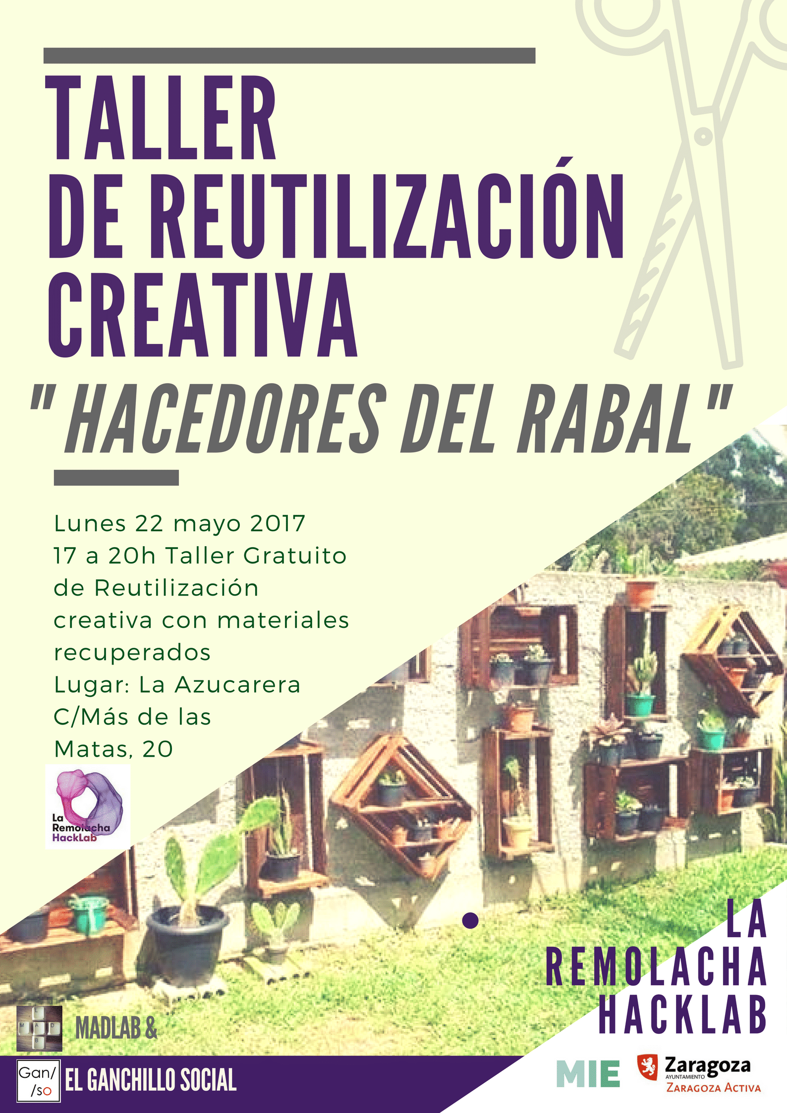 "Hacedores del Rabal" es un lugar donde construiremos colectivamente objetos, equipamientos y algún artefacto para el barrio a partir de material reutilizado. La Remolacha Hack-Lab se convierte en cuartel de batalla desde el que transformar, apañar y customizar nosotras mismas.Es una herramienta del ganchillo social, de proyecto Innobarrio.