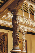 Se ha reforzado su fachada, con mirador de arcos doblados de medio punto y alero clasicista. Este patio tiene esbeltas columnas jónicas anilladas soportando un piso alto con la habitual arquería de medio punto sobre columnillas también jónicas. Destacan los motivos en relieve de las enjutas que denotan unas fechas de ejecución relativamente avanzadas dentro del siglo.