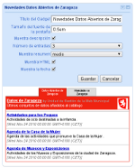 Este widget se conecta al canal RSS del catálogo de conjuntos de datos y muestra las últimas novedades. Además, se incluye otra pestaña con las últimas noticias del Ayuntamiento de Zaragoza.