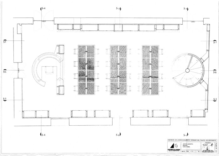 La sala noble del palacio renacentista se rehabilita como un espacio para el público, con dos alturas conectadas por una escalera de caracol. En la parte inferior, las mesas de consulta y la colección de libre acceso de la bibliteca y de la hemeroteca, la parte superior para la consulta de microfilms.