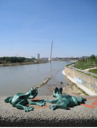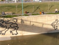 Las diez de gran tamaño que se ven en el muro fueron una adición de última hora, porque esa pared tan vacía parecía una tentación irresistible para grafiteros, así que se rellenó con estas siluetas y con plantas trepadoras; pero nada más que empecemos a pasear por la Avenida de Ranillas descubriremos que hay más de seiscientas ranitas de bronce encaramadas en rocas o en el pretil, escondidas bajo los bancos y fuentes, e incluso por el cubo de hormigón situado, como parte de esta intervención artística, a la entrada del parque, donde están las firmas de Arrudi y Bayo. Dependiendo de la estación, algunas estarán semicubiertas por la vegetación, cosa que ya habían planteado años antes estos dos especialistas aragoneses en arte público cuando empezaron a pensar en la urbanización del antiguo camino de Ranillas con unas pérgolas geométricas cubiertas de enredaderas, pero el topónimo les inspiró un homenaje escultórico a los batracios que lo poblaban en otros tiempos y cuando en 2006 presentaron su proyecto al concurso de Expoagua fue ya con esta idea, que respondía a la categoría de "obras estrictamente escultóricas de tamaño medio o pequeño para su seriación y multiplicación en extensos sectores de actuación". Sería la primera intervención artística inaugurada por Expoagua, ya en diciembre de 2007, y acogida con tanto entusiasmo entre los ciudadanos que las ranillas de bronce están a la venta en muchas galerías de arte de la ciudad y -si bien es cierto que algunas figuras han sido robadas- en general no han sufrido demasiados actos vandálicos. Arrudi está tan orgulloso de ellas que incluso ha hecho colocar algunas en su escultura Las Tres Sorores , que está al comienzo de este parque, junto al Puente de la Almozara, donde también encontraremos algunas ranitas encaramadas.