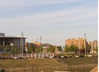 Detrás de este banco queda el Bosque Sonoro de Christopher Janney, una instalación interactiva a base de columnas de aluminio de casi dos metros y medio de alto, dotadas por este artista estadounidense con dispositivos tecnológicos capaces de producir luces de colores y sonidos acuáticos cambiantes en función de los movimientos y manipulaciones del público en torno a ellas. Desde que el artista la concibió en 1991, la ha sido montando en diferentes lugares del mundo transitados por muchedumbres, y es de esperar que esta versión zaragozana volverá a entrar en actividad en la medida en que el recinto de la Expo se abra a futuros usos. Lo mismo ocurría con la escultura de cristal titulada Manierismo Rococó , que se encontraba un poco más hacia el este, igualmente cerca del río; pero que tras ser vandalizados algunos de sus cristales ha sido restaurada y trasladada en enero de 2011 al vestíbulo del Edificio Seminario, reutilizado para oficinas municipales También esta pieza de Dan Graham cobra pleno significado cuando este laberinto de cristales curvos es recorrido por el público. Incluso desde la orilla opuesta del Ebro ambas constituyen un indudable reclamo visual y estético; en cambio, apenas nada puede verse de la instalación Appearing Rooms de la danesa Jeppe Hein, situada aguas abajo, porque nunca ha tenido materialidad física ese laberinto de "habitaciones que aparecen", ya que sus paredes estaban formadas por surtidores de agua que emergían aleatoriamente para sorprender a los incautos visitantes que entraban a jugar con la fuente y casi siempre acababan mojados. Una vez reabierto el recinto de la Expo al público, ya funciona de nuevo esta versión zaragozana de una fuente artística que instaló primeramente en Basilea (Art Basel 2004) y luego en otras ciudades. Ahora que los transeúntes vuelven a deambular por el recinto, estas tres instalaciones artísticas interactivas volverán a funcionar plenamente, no sólo para regocijo de quienes quienes las recorran, sino también para quienes los miren desde lejos.